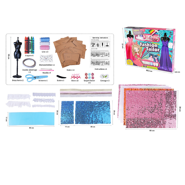 Coffret couture créatif ✂️ Fashion Tailor DIY pour enfants. Permet de créer et personnaliser des robes avec tissus et accessoires inclus. À partir de 8 ans.