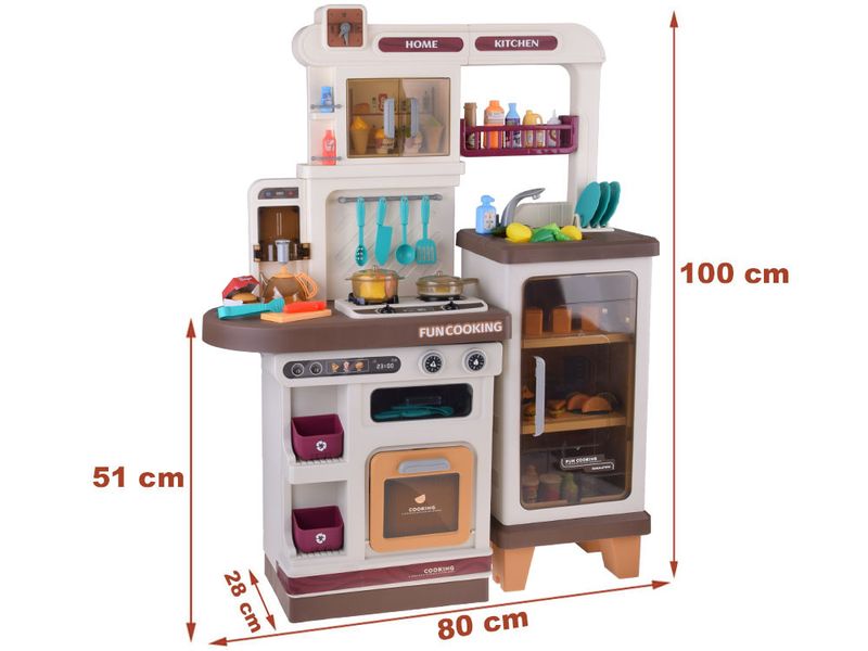 Cette cuisine inclut un four, des placards, un évier avec robinet fonctionnel (eau circulante), une plaque de cuisson simulant la cuisson avec sons et lumières, ainsi que de multiples ustensiles et aliments factices. Les enfants peuvent ainsi inventer leurs propres recettes et s’initier aux plaisirs de la cuisine dans un cadre amusant et sécurisé.