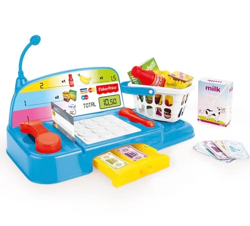 Caisse enregistreuse Fisher-Price avec accessoires (billets, pièces, carte, panier et aliments factices) – idéale dès 2 ans pour apprendre et s’amuser.