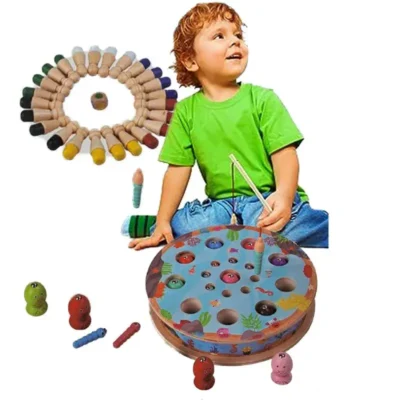 Le Three in One Fishing Game est un jeu éducatif en bois qui combine 3 activités ludiques autour du thème de la pêche et des couleurs. Grâce à ses pièces en bois colorées et ses cannes magnétiques, il permet aux enfants de développer leur coordination, leur patience et leur sens de l’observation.