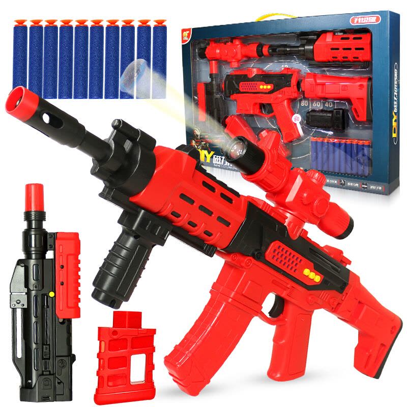 Grâce à son système magnétique, l’enfant peut construire et personnaliser son arme avec plusieurs accessoires interchangeables (viseur, crosse, chargeur, silencieux, etc.).