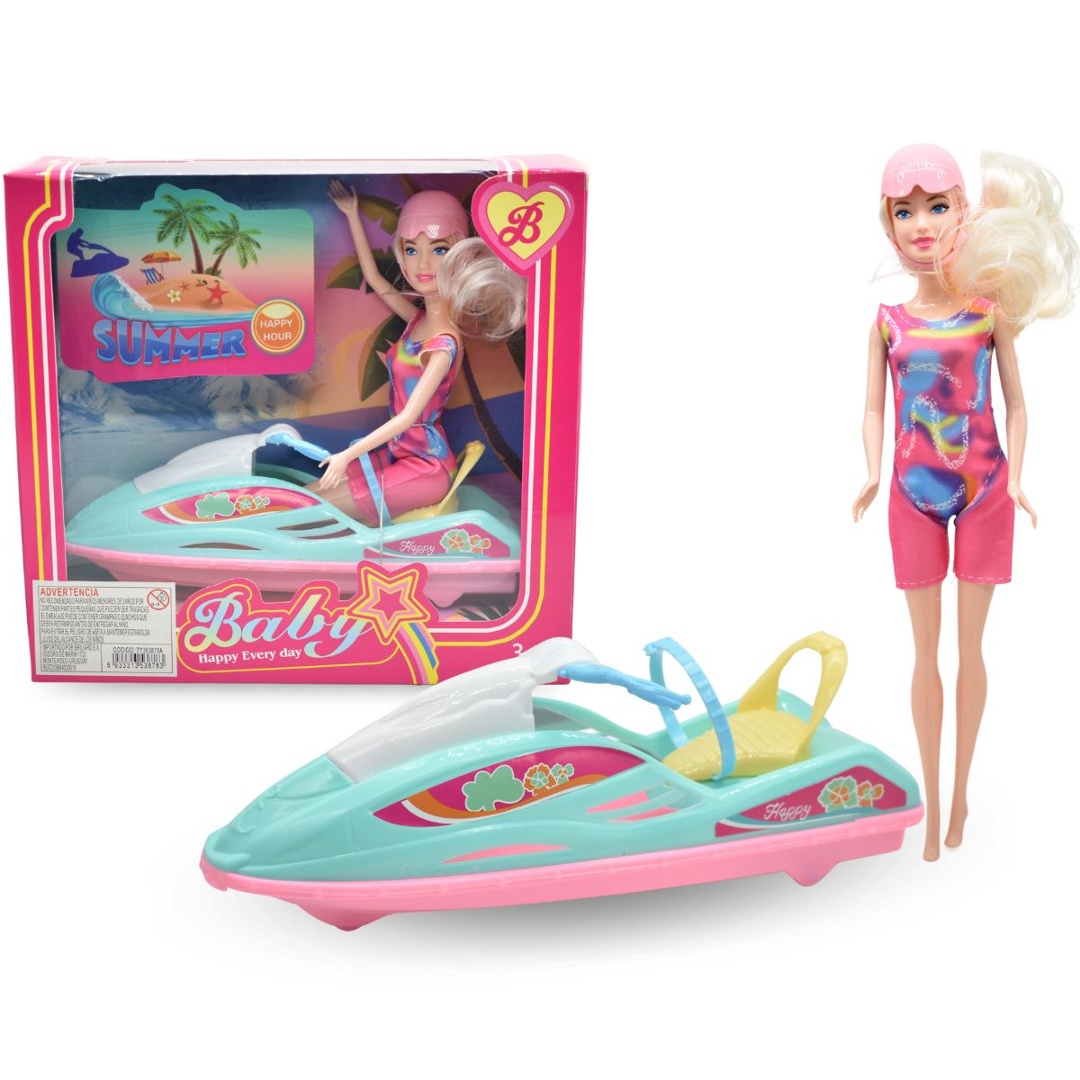 Poupée fashion avec jet ski coloré – idéale pour des aventures d’été pleines de fun dès 3 ans.