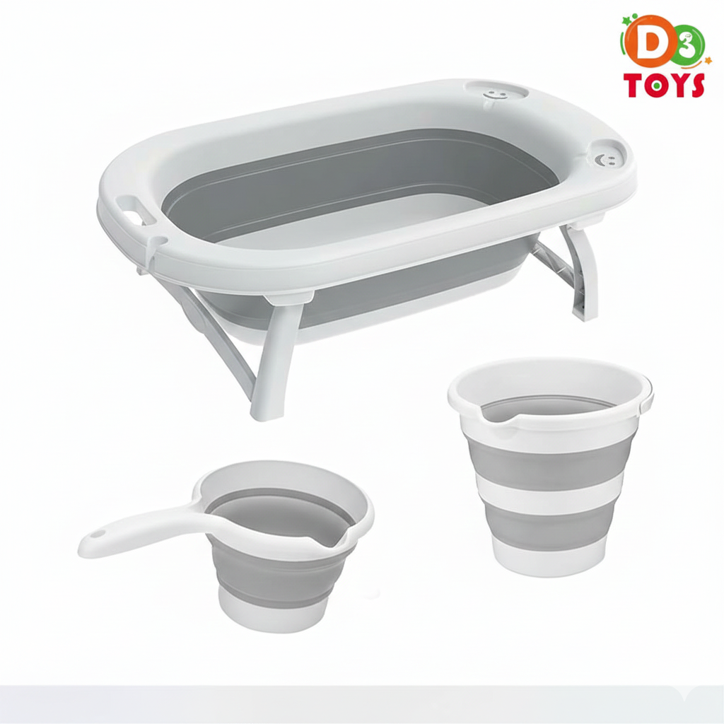 Fabriquée à partir de matériaux résistants et sûrs, elle est accompagnée d’accessoires pratiques tels qu’un seau pliable et une louche, facilitant le bain du bébé à la maison ou en déplacement. Son design stable et ergonomique garantit une utilisation confortable pour les parents et agréable pour l’enfant.