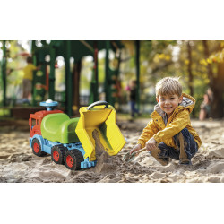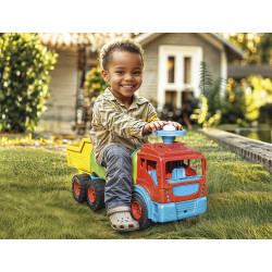 Camion porteur robuste 6 roues avec benne basculante et volant facile à tourner. Parfait pour jouer, transporter et développer la motricité des enfants.