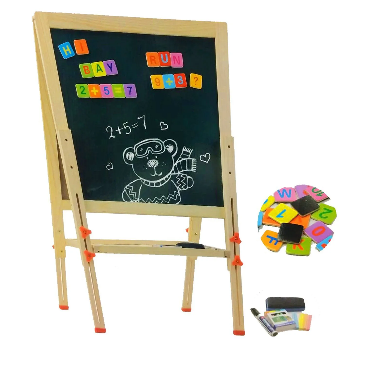 Chevalet éducatif en bois avec tableau blanc magnétique, lettres et chiffres aimantés. Parfait pour apprendre en jouant : écrire, dessiner, compter et reconnaître les lettres. Convient dès 3 ans.