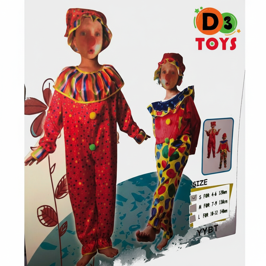 Costume composé d’une combinaison large et confortable avec motifs pois et couleurs vives, accompagné d’un chapeau assorti pour un look clown complet. Léger, doux et facile à porter, il permet à l’enfant de bouger, courir et jouer sans gêne.