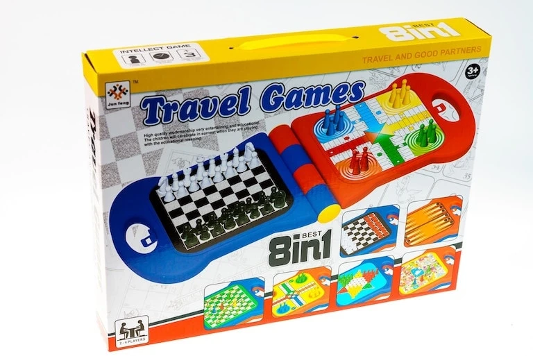 Jeu de société 5 en 1 avec plusieurs plateaux classiques, éducatif et facile à transporter.