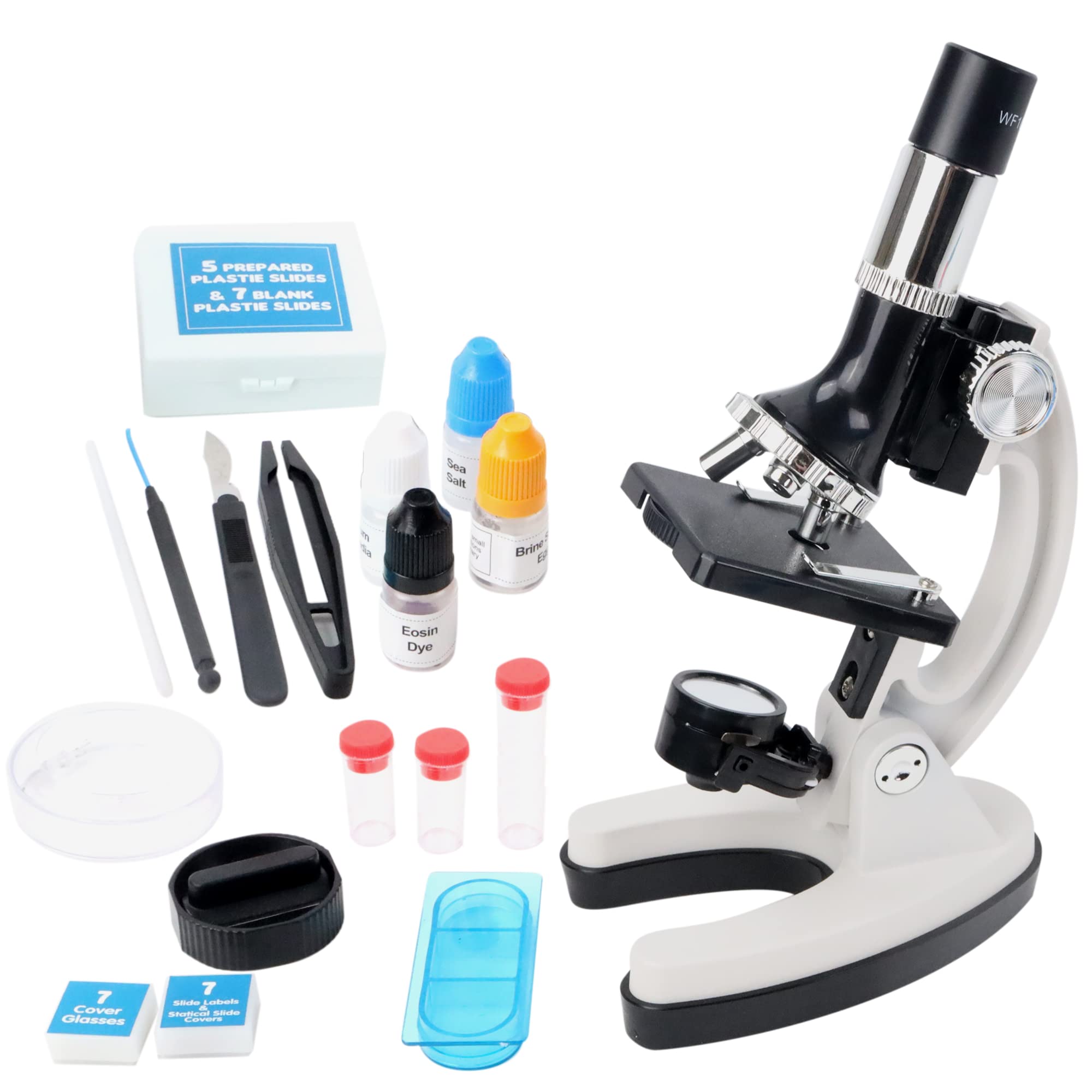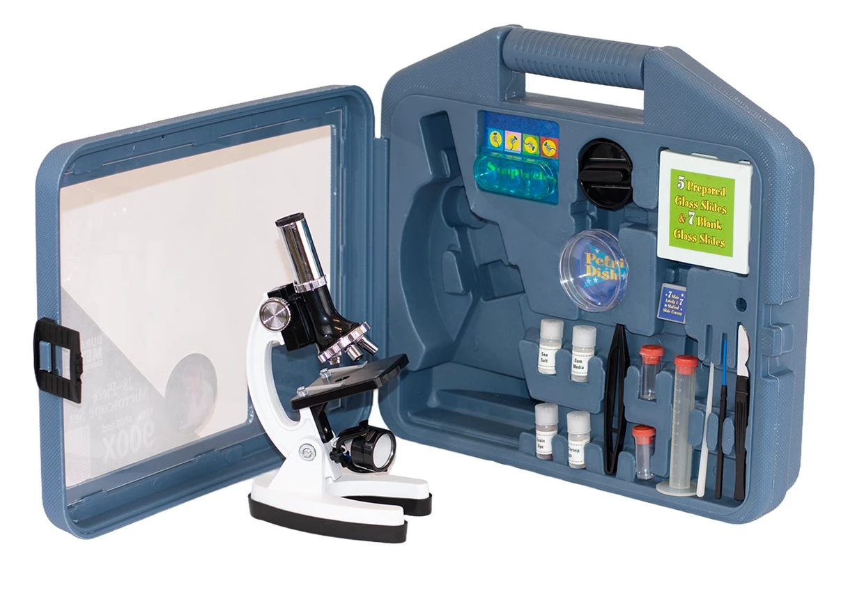 Livré avec accessoires : lames d’observation, pinces, flacons, éprouvettes, etc.