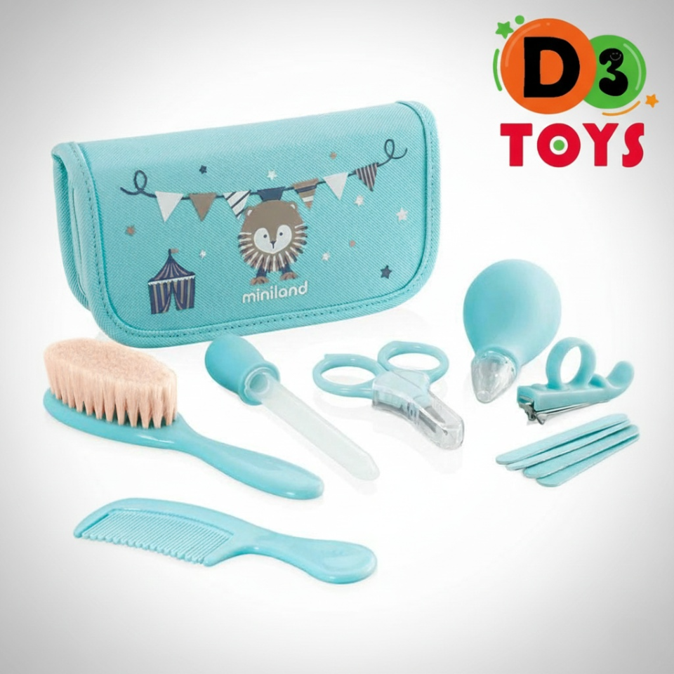 Kit complet d’hygiène pour bébé Miniland, comprenant 7 accessoires essentiels avec une trousse imperméable, idéal pour la maison et les voyages.