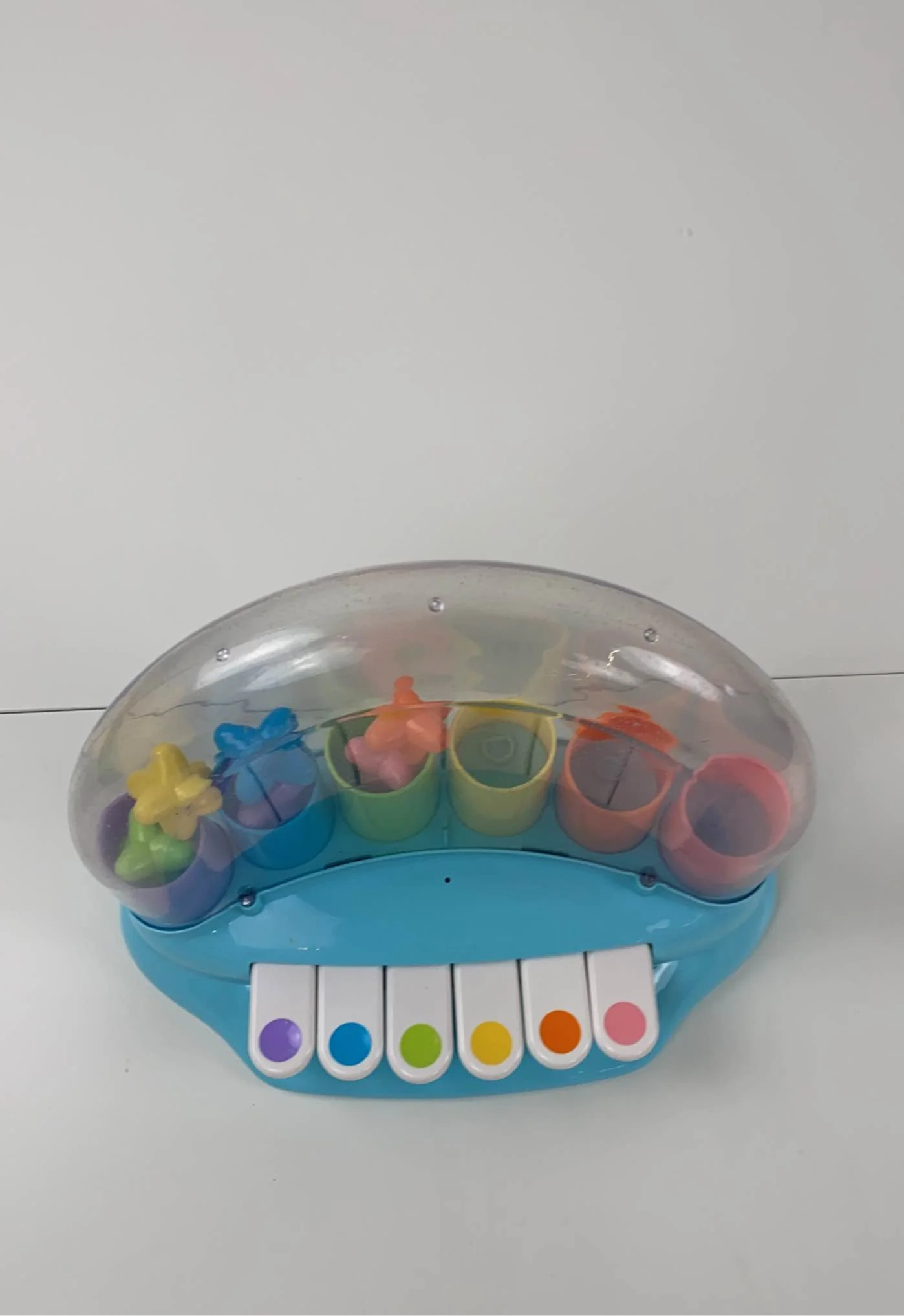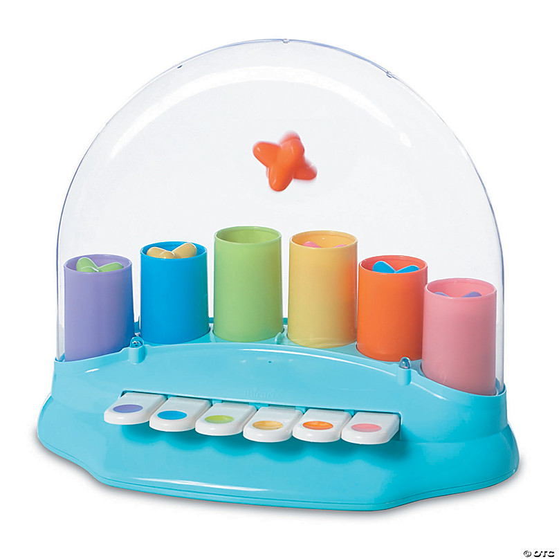 Chaque touche colorée active un cylindre qui fait sauter une forme correspondante : étoile, fleur, cœur, etc. L’enfant apprend ainsi à reconnaître les couleurs, les formes et la relation cause-effet.