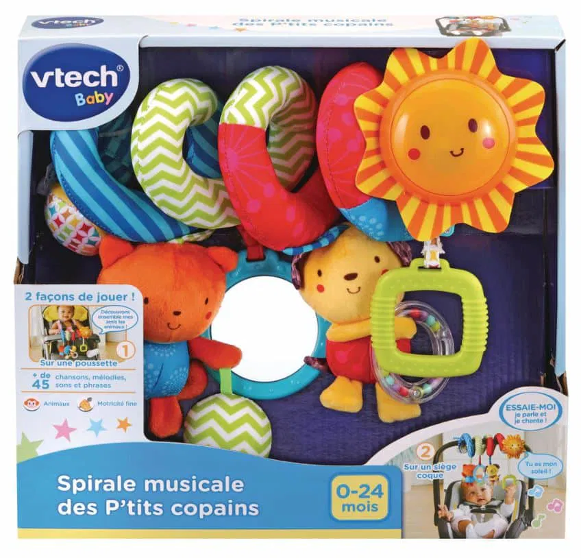 La spirale musicale VTech P’tits Copains est un jouet d’éveil coloré conçu pour divertir et stimuler bébé dès la naissance. Facile à fixer sur une poussette, un siège auto ou un parc, elle propose plusieurs personnages adorables, un miroir sécurisé, des textures variées et des éléments à manipuler. Grâce à plus de 45 chansons, mélodies et phrases, cette spirale favorise le développement sensoriel, la motricité fine et l’éveil musical de bébé, tout en l’accompagnant dans ses déplacements.