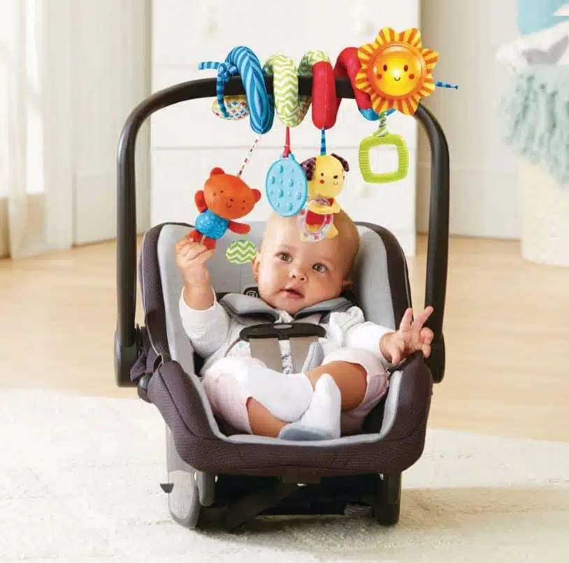 Spirale musicale VTech à fixer sur poussette ou siège auto, idéale pour l’éveil des bébés de 0 à 24 mois.