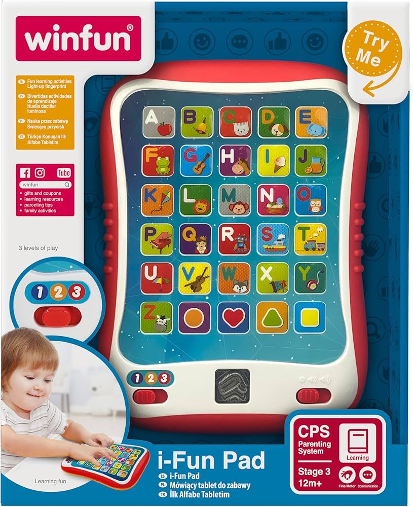 La tablette éducative i-Fun Pad Winfun est un jouet interactif conçu pour initier les tout-petits à l’apprentissage des lettres, des chiffres, des formes et des sons. Grâce à ses boutons lumineux tactiles et ses illustrations colorées, elle stimule la curiosité de l’enfant tout en développant la motricité fine, la coordination main-œil et les capacités cognitives. Elle propose plusieurs niveaux de jeu et des activités amusantes qui favorisent l’apprentissage par le jeu, en toute sécurité. Solide et facile à manipuler, elle est parfaitement adaptée aux petites mains.