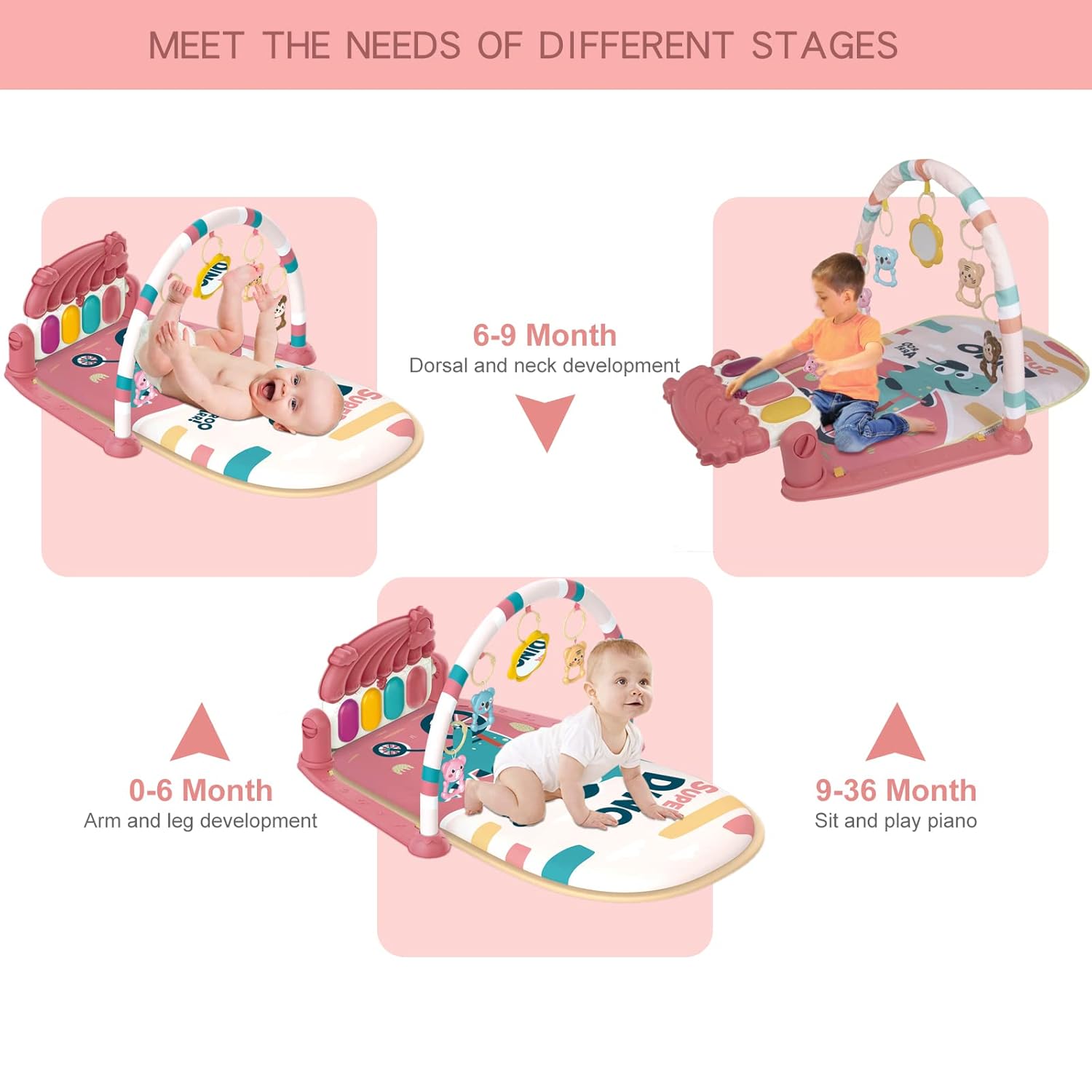 Ce tapis d’éveil multifonction est conçu pour accompagner le développement sensoriel et moteur de bébé dès ses premiers mois. Il est équipé d’arceaux avec jouets suspendus colorés, d’un piano musical interactif et de hochets amovibles pour stimuler la vue, l’ouïe et le toucher.
